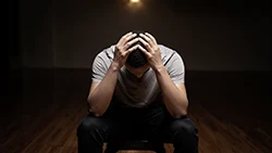 Мужчина сидит на стуле посередине комнаты опустив голову