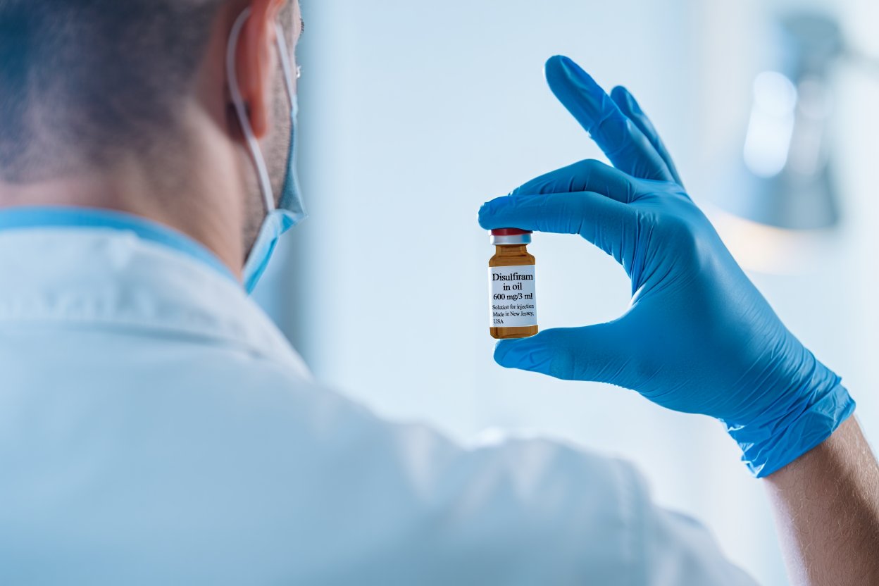 Врач держит флакон из под дисульфирама